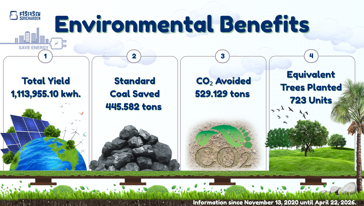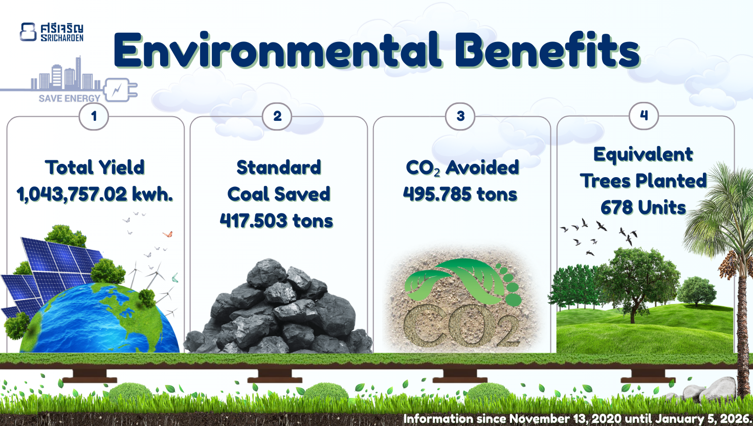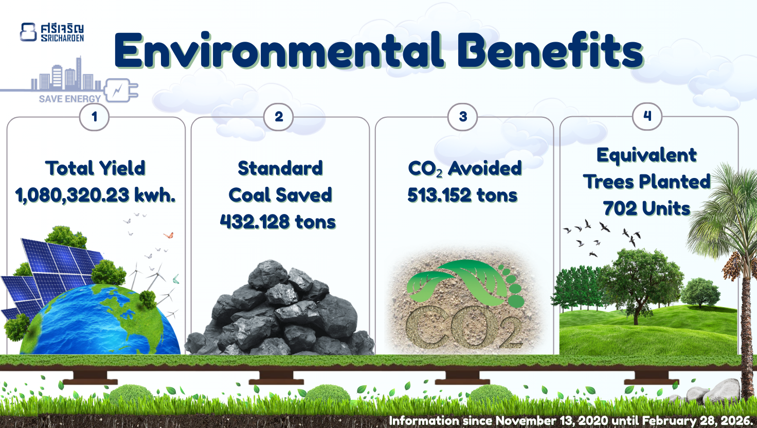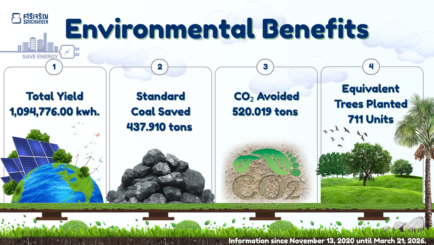 เราได้ติดตั้งระบบโซลาร์เซลล์ขนาดใหญ่ เพื่อผลิตไฟฟ้าใช้ภายในโรงงานมาตั้งแต่วันที่ 13 พฤศจิกายน 2563 จนถึงปัจจุบัน สิ่งนี้ช่วยให้เราลดการใช้พลังงานจากแหล่งที่ไม่หมุนเวียน และลดผลกระทบต่อสิ่งแวดล้อมได้อย่างเป็นรูปธรรม